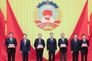 4月24日,全国政协在北京隆重举行仪式,向不再连任的在京十二届全国政协常委颁发纪念证牌。全国政协主席汪洋出席仪式并讲话。这是汪洋等向部分不再连任的常委颁发纪念证牌。新...