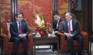 新华社北京4月17日消息,国家副主席王岐山当日在中南海会见越共中央政治局委员、中央书记处书记、中央经济部部长阮文平率领的越南共产党代表团。王岐山表示,中国特色社会主义...