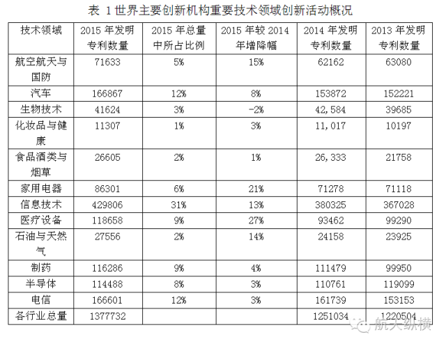 近期,全球著名的信息供应商汤森路透公司发布了《2016全球创新报告》(2016 State of Innovation),基于专利数据和全球科技文献对全球创新活动进行深入分析,涵盖航空航天与国防、汽车制造、半导体、医疗等12个行业领域。报告显示,2015 年全球创新活动同比实现两位数的增长,其中医疗器械、家用电器、航空航天与国防、信息技术及石油与天然气等领域的增长最为显著。