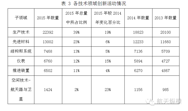 航空航天与国防领域的创新活动主要集中在生产技术、先进材料、结构和系统等领域。生产技术领域的发明专利达到2.2万余件,占总量的39%,较2014增长19%。